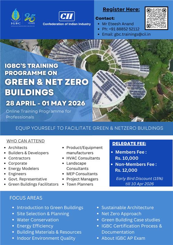 Indian Green Building Council's (IGBC) rating systems launched since 2007 had made rapid strides in the Green Building sector. These rating systems have been successfully applied in India in as many as 18,850+ buildings, till date with a footprint of 15.52 Billion sq.ft. Many Government, corporate, builders & developers in India have taken lead in constructing Green Buildings. With the growing demand for Green Buildings, there is a need to enhance the knowledge of building professionals on Green Building concepts & equip them on the Green Building rating systems.